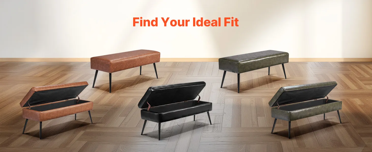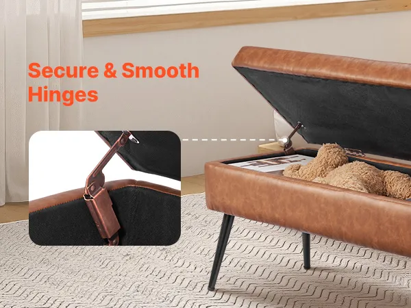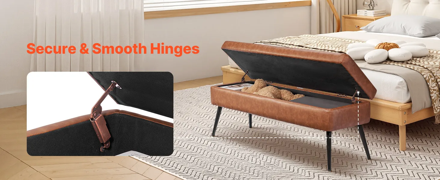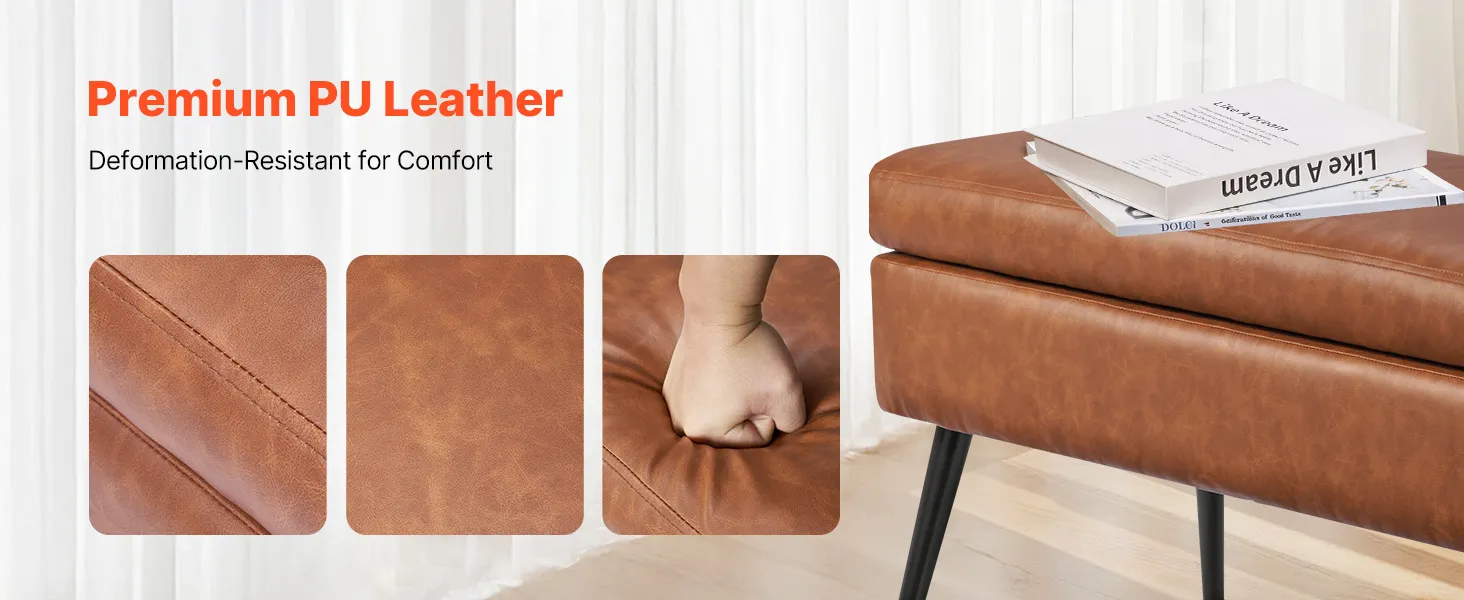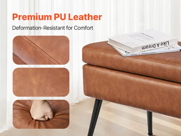 Gładka skóra PU: Wysokiej jakości skóra PU o jedwabistej fakturze i wyrafinowanych przeszyciach. Wodoodporna i łatwa w czyszczeniu, idealna do zapracowanych gospodarstw domowych. Nasza ława ze schowkiem doda Twojej sypialni nowoczesnego, wyrafinowanego akcentu.