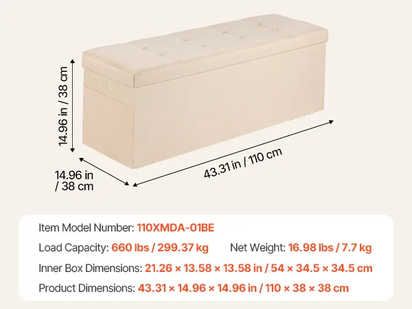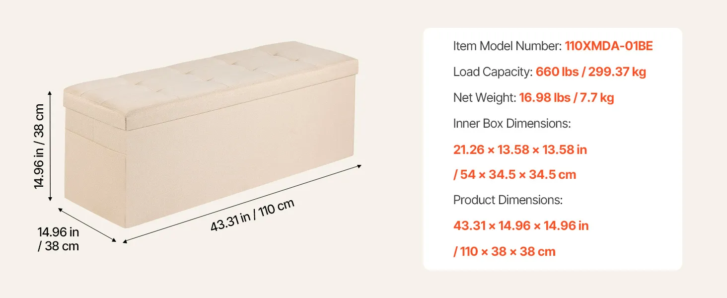 Wysoka nośność: Puf ze schowkiem wytrzymuje obciążenie do 229,37 kg (660 funtów) i jest wykonany z wysokiej jakości płyty MDF, co gwarantuje długotrwałe użytkowanie bez odkształceń i chybotania. Zapewnia niezawodne podparcie podczas siedzenia i przechowywania w codziennym użytkowaniu.