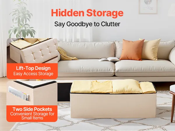 Puf VEVOR składany ze schowkiem (prostokątny), podnóżek z kieszeniami bocznymi, składany, wyściełany stołek, nośność do 299,37 kg, 11 x 38 x 38 cm, do salonu, sypialni, przedpokoju, beżowy
