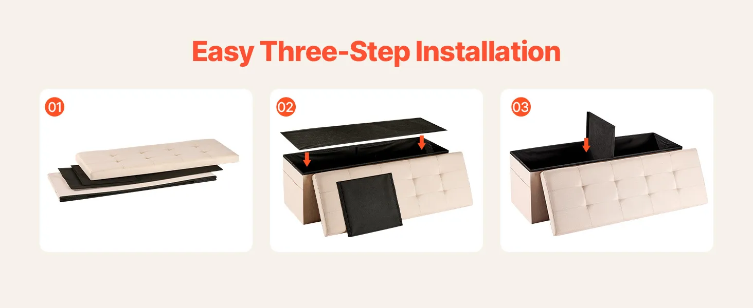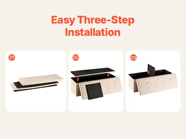 Nie potrzebujesz żadnych specjalnych narzędzi – montaż zajmuje tylko dwa kroki. Nasz puf ze schowkiem jest łatwy w montażu i idealnie wpasowuje się w wystrój Twojego domu. Ciesz się komfortem i wygodą w mgnieniu oka.