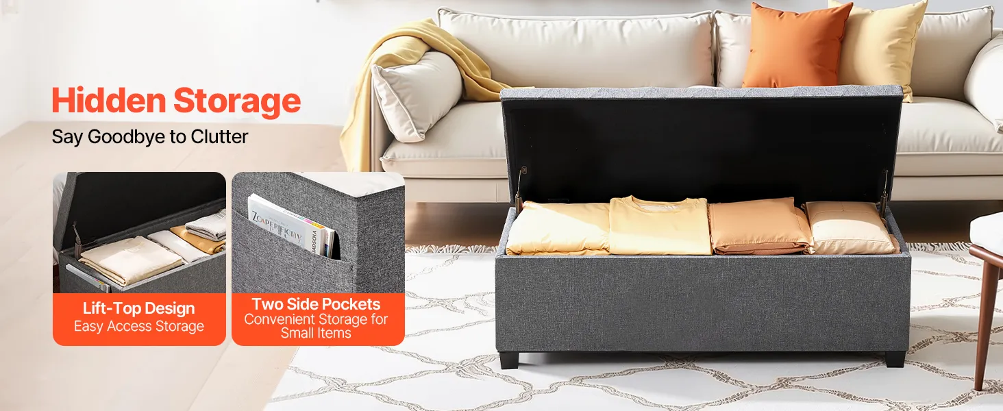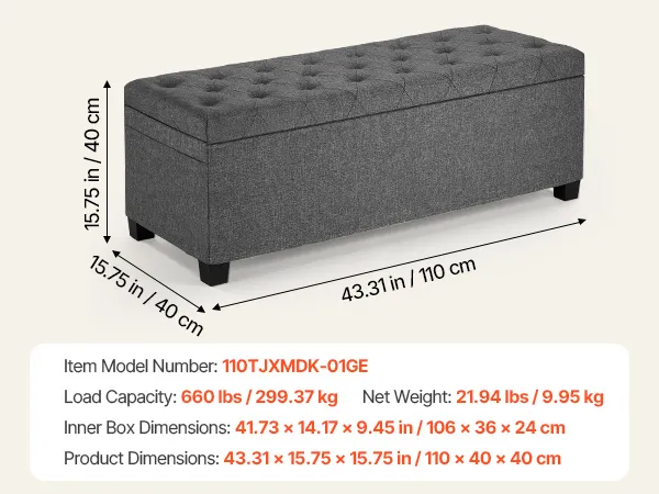 Puf VEVOR ze schowkiem, 110 x 40 x 40 cm, skrzynia do przechowywania podnóżka, nośność do 299,37 kg, składana, wyściełana ławka z metalową ramą, puf do salonu, sypialni, przedpokoju, szary