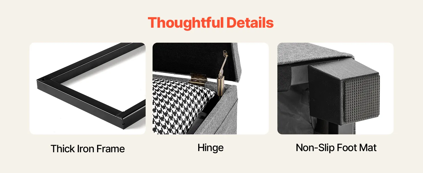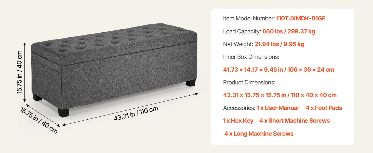 Wysoka ładowność: Puf ze schowkiem wytrzymuje obciążenie do 299,37 kg (660 funtów) i posiada wzmocnioną żelazną ramę oraz wysokiej jakości konstrukcję z płyty MDF, co gwarantuje długotrwałe użytkowanie bez odkształceń i chybotania. Zapewnia niezawodne podparcie podczas siedzenia i przechowywania.