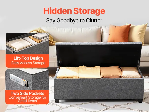 Duża pojemność: Ława ze schowkiem oferuje miejsce na pościel, koce i przedmioty codziennego użytku. Dwie przegrody pozwalają utrzymać porządek, a boczne kieszenie pomieszczą piloty, książki i chusteczki. Odchylana pokrywa zapewnia wygodny dostęp.