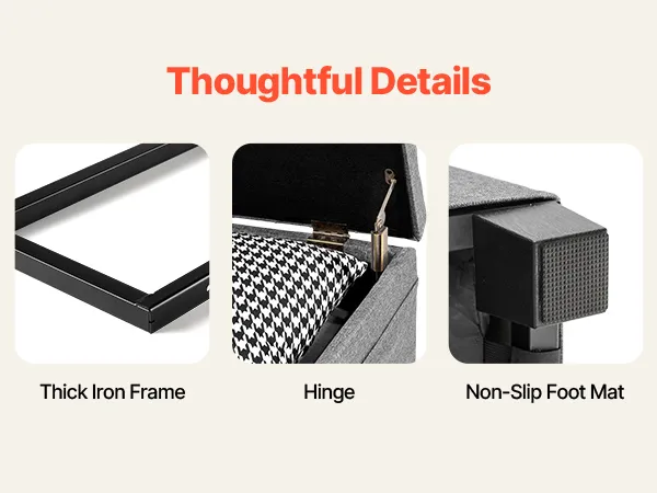 Nasza pufa ze schowkiem ma wzmocnioną, żelazną ramę i wysokiej jakości zawiasy zapewniające niezawodne podparcie. Antypoślizgowe podkładki chronią podłogi przed zarysowaniami i poślizgiem, zapewniając stabilność podczas użytkowania. Każdy szczegół został zaprojektowany z myślą o komforcie i bezpieczeństwie.