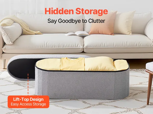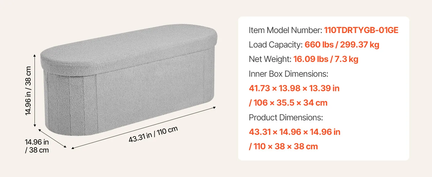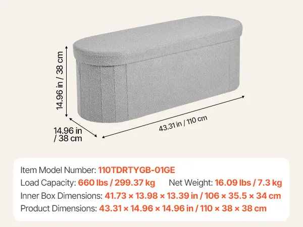 Wysoka nośność: Puf ze schowkiem wytrzymuje obciążenie do 299,37 kg (660 funtów) i jest wykonany z wysokiej jakości płyty MDF, co gwarantuje długotrwałe użytkowanie bez odkształceń i chybotania. Zapewnia niezawodne podparcie podczas siedzenia i przechowywania w codziennym użytkowaniu.