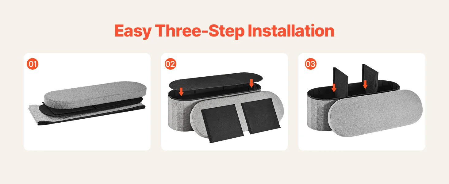 Nie potrzebujesz żadnych specjalnych narzędzi – montaż zajmuje tylko trzy kroki. Nasz puf ze schowkiem jest łatwy w montażu i idealnie wpasowuje się w wystrój Twojego domu. Ciesz się komfortem i wygodą w mgnieniu oka.