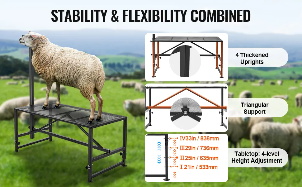 Stojak na kozy i owce VEVOR ma regulowaną wysokość od 21 do 33 cali. Ta cecha pozwala mu obsługiwać różne rozmiary zwierząt gospodarskich. Nakrycie głowy jest również regulowane, pasuje do szyi o długości od 46 do 64,1 cala. Tak więc stojak ten może być używany dla wielu ras. Niezależnie od tego, czy masz małe kozy, czy duże owce, stojaki mogą je pomieścić. Regulowana konstrukcja gwarantuje bezpieczne i wygodne trzymanie zwierzęcia. Jest szczególnie przydatny w gospodarstwach wielogatunkowych lub dla tych z różnymi rozmiarami zwierząt gospodarskich.
