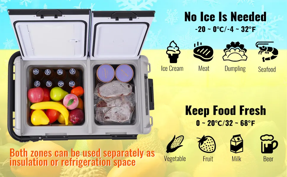 Duża pojemność: Przenośna lodówka z zamrażarką ma pojemność 52,8 qt (50 l) w dwóch komorach. Ta wytrzymała lodówka kempingowa pomieści 64 puszki coli (330 ml), 36 butelek wody (550 ml) lub 12 butelek czerwonego wina (750 ml), a także owoce morza, przekąski, mięso i napoje, spełniając potrzeby podczas długich podróży, takich jak podróże, pływanie łódką i kemping.