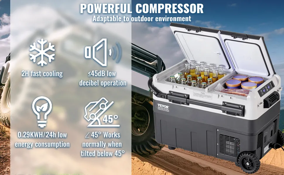Szybkie chłodzenie w 2 godziny: Ta 12-woltowa lodówka samochodowa wykorzystuje chłodzenie kompresorowe i osiąga temperaturę graniczną -20°C (-4°F) w ciągu około 2 godzin przy temperaturze otoczenia 77°F (ok. 25°C). Szybko chłodzi i działa płynnie nawet przy nachyleniu do 45 stopni. Dzięki temu idealnie nadaje się na kemping lub do pracy, zapewniając świeżość żywności. Nie wymaga kostek lodu, co zapobiega psuciu się żywności i oszczędza pieniądze oraz miejsce.