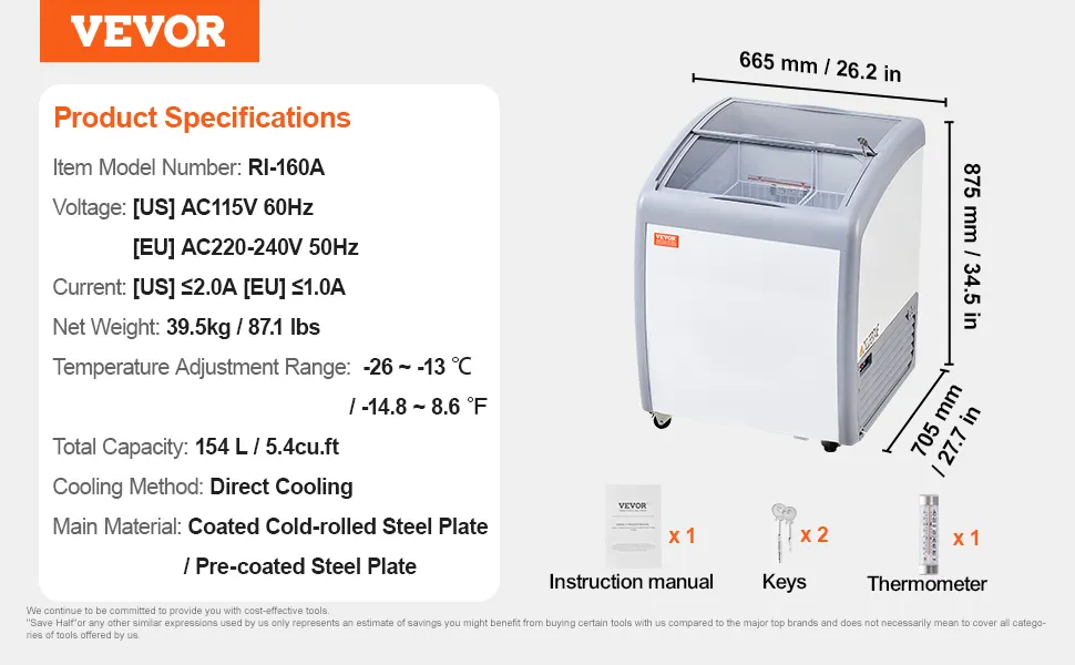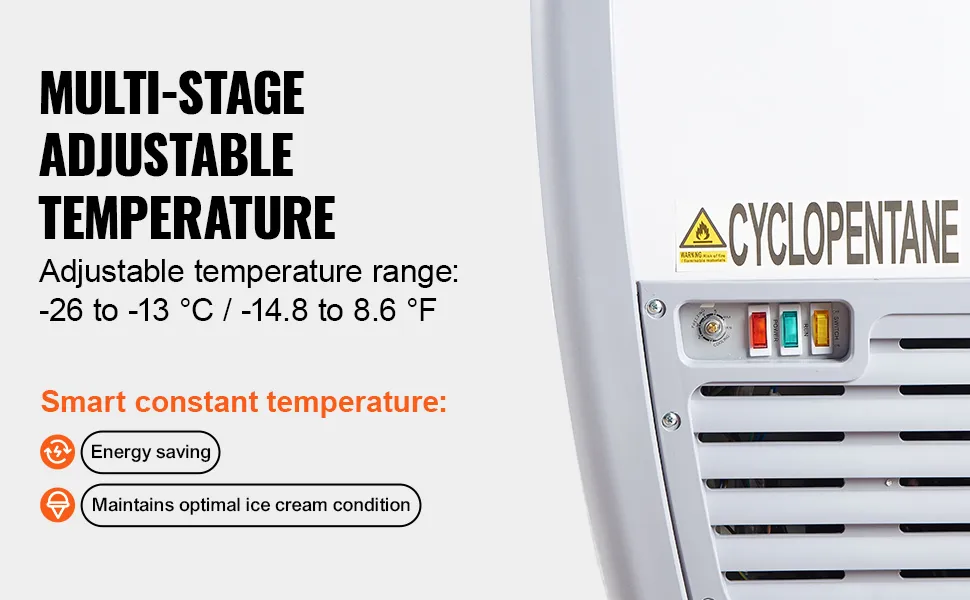 Regulowana temperatura: Lodówka posiada wielostopniowy zakres regulacji temperatury od -26 do -13°C (od -14,8 do 8,6°F), aby sprostać zróżnicowanym potrzebom mrożenia. Termostat utrzymuje lód w optymalnym stanie, oszczędzając jednocześnie energię.
