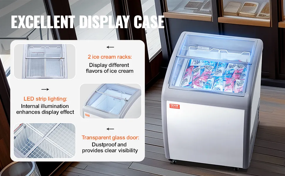 Profesjonalna gablota na lody: Ta komercyjna gablota na lody posiada dwa koszyki na lody i jest wyposażona w oświetlenie LED oraz drzwi z hartowanego szkła o wysokiej widoczności, co zapewnia lepszą prezentację. Klienci mogą łatwo wybrać swoje ulubione lody.