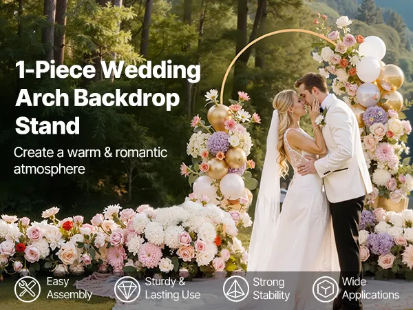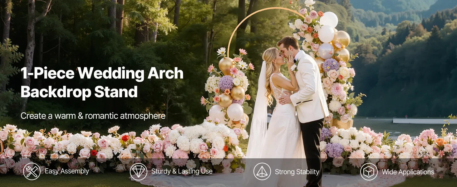 Elegancki design: Ten jednoczęściowy, łukowy stojak na tło o wymiarach 2,2 x 1,2 m (7,2 x 4 stopy) nadaje się zarówno do użytku wewnątrz, jak i na zewnątrz. Wzmacnia efekt wizualny i tworzy wyjątkową, romantyczną atmosferę na każdej uroczystości.