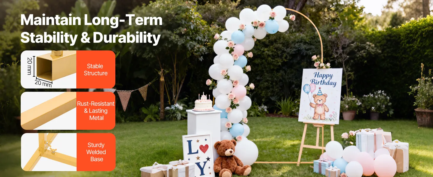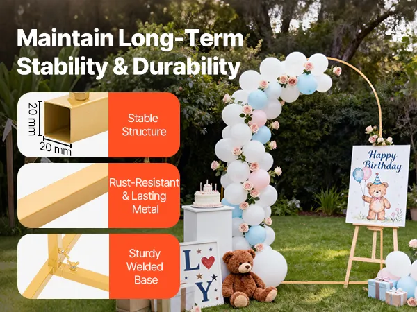 Stabilne podparcie: Ten metalowy stojak na tło z łukiem ma wzmocnioną, spawaną podstawę. Zwiększa to stabilność, zapewnia stabilne podparcie i ogranicza chwianie się, gwarantując, że dekoracje pozostaną na swoim miejscu.