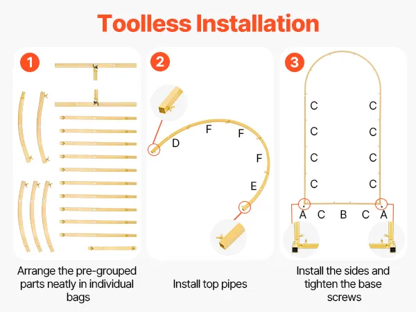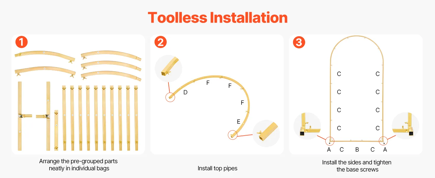 Łatwy montaż: Części są wstępnie posortowane i zapakowane w osobne woreczki, co ułatwia montaż. Nasze złote tło w kształcie łuku jest wyposażone w system nakrętek motylkowych, który umożliwia szybki montaż i demontaż bez użycia narzędzi.