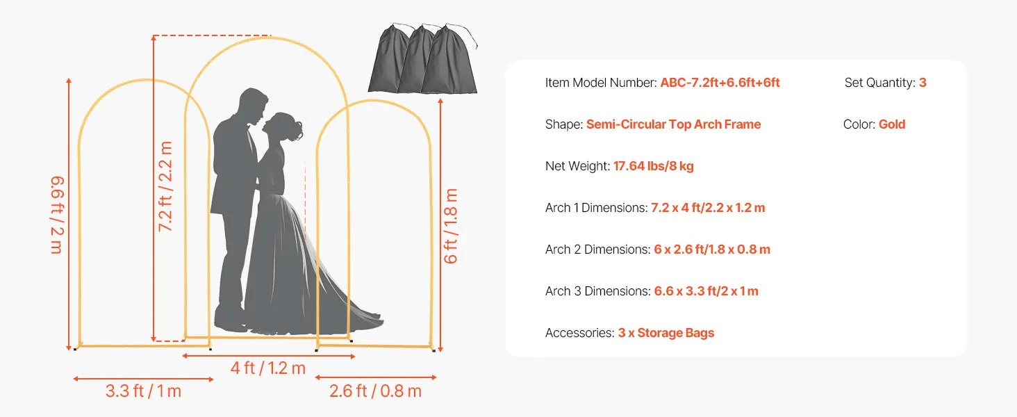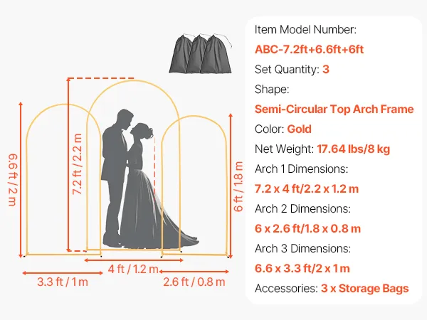 Łuk ślubny VEVOR, zestaw 3 szt., 2,2/2/1,8 m, stojak na tło, złoty łuk metalowy, łuk ślubny, łuk balonowy na wesela, przyjęcia urodzinowe, ukończenia szkoły, święta i dekoracje na ceremonie
