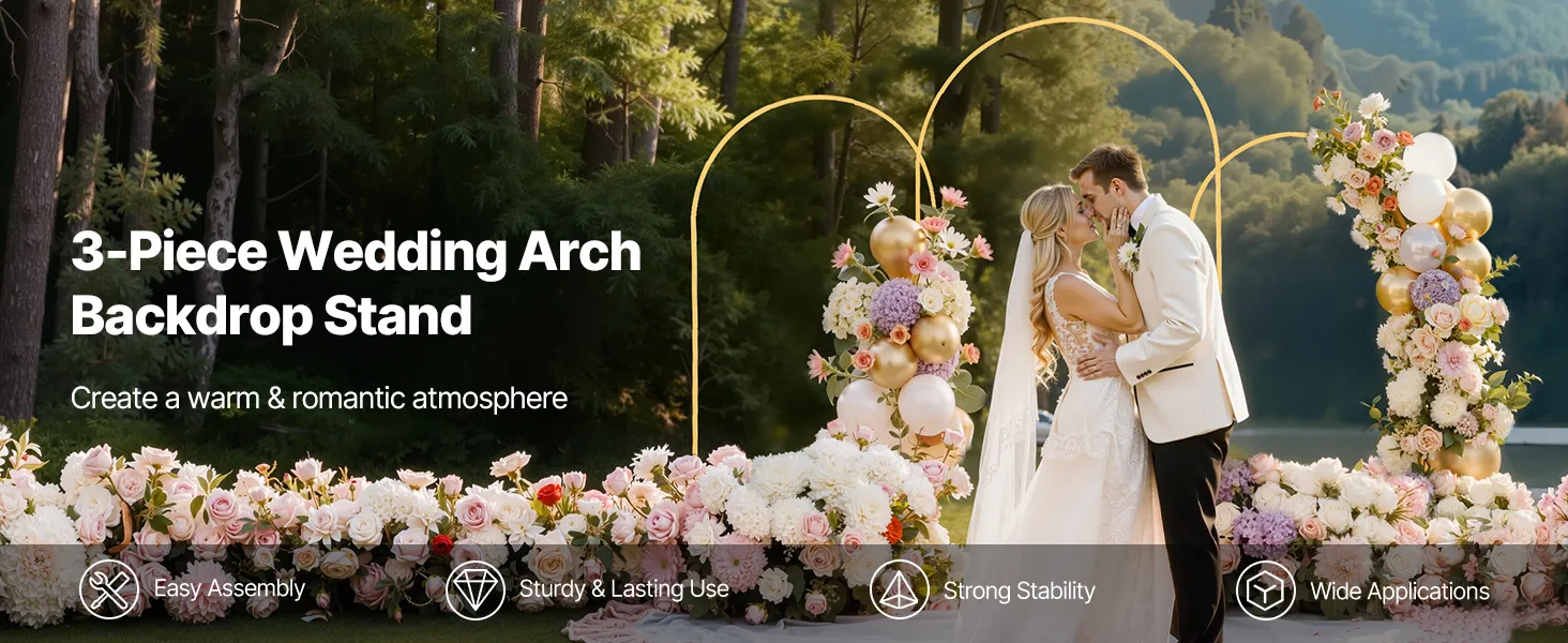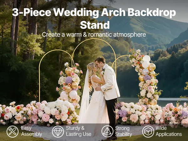 Ten 3-częściowy system łukowego tła jest łatwy w montażu. Dzięki metalowej ramie jest stabilny i trwały. Idealnie nadaje się na imprezy zarówno wewnątrz, jak i na zewnątrz, tworząc ciepłą i romantyczną atmosferę.
