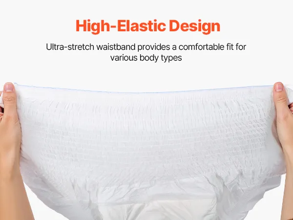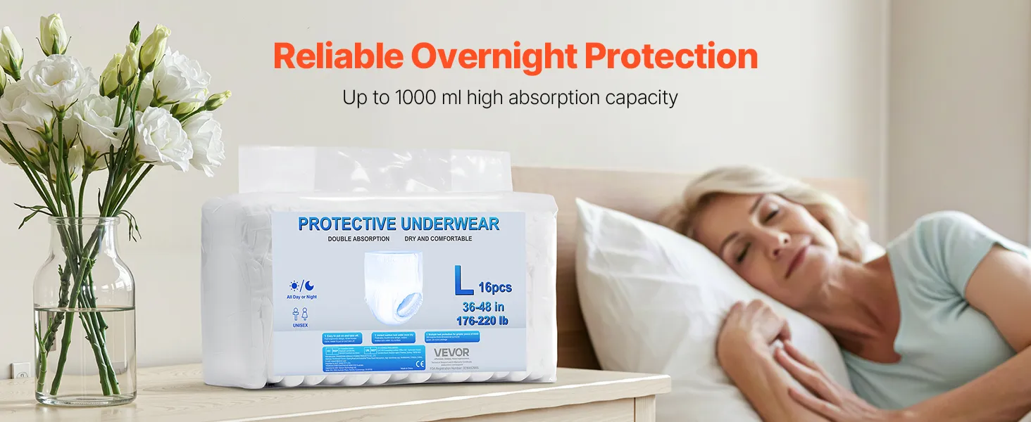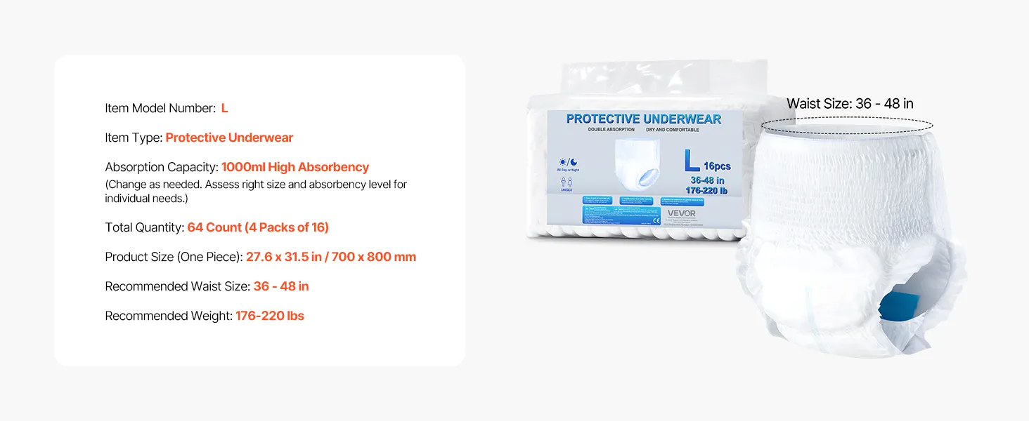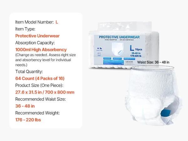 Wysoka chłonność: bielizna dla dorosłych na nietrzymanie moczu VEVOR w rozmiarze L jest idealna dla mężczyzn i kobiet z problemami z pęcherzem lub nietrzymaniem moczu. Bardzo chłonny podwójny rdzeń mieści do 1000 ml płynu i szybko go zamyka, zapewniając suchość i wygodę. Zalecane dla obwodów talii od 91 do 121 cm i masy ciała 79-100 kg.