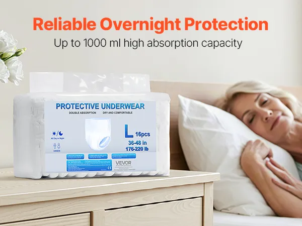 Ta ochronna bielizna zapewnia wysoce chłonną ochronę i może wchłonąć do 1000 ml płynu. Zapewnia wielokrotną ochronę przed przeciekami dzięki ściśle dopasowanej elastycznej talii, trójwymiarowej ochronie dookoła i niebieskiej warstwie chłonnej dla niezawodnej ochrony w dzień i w nocy.