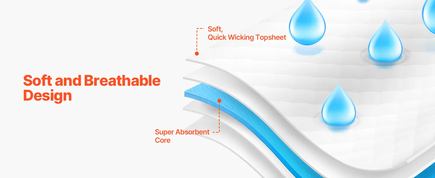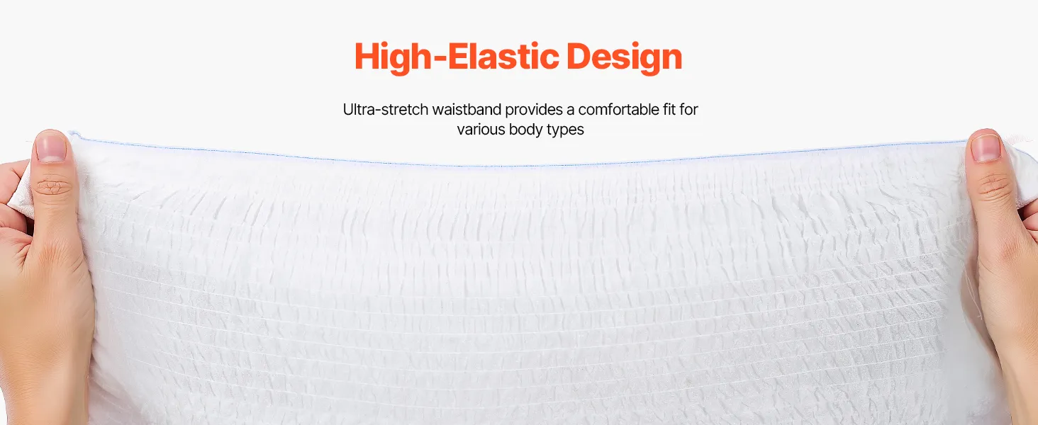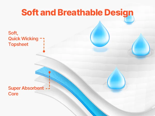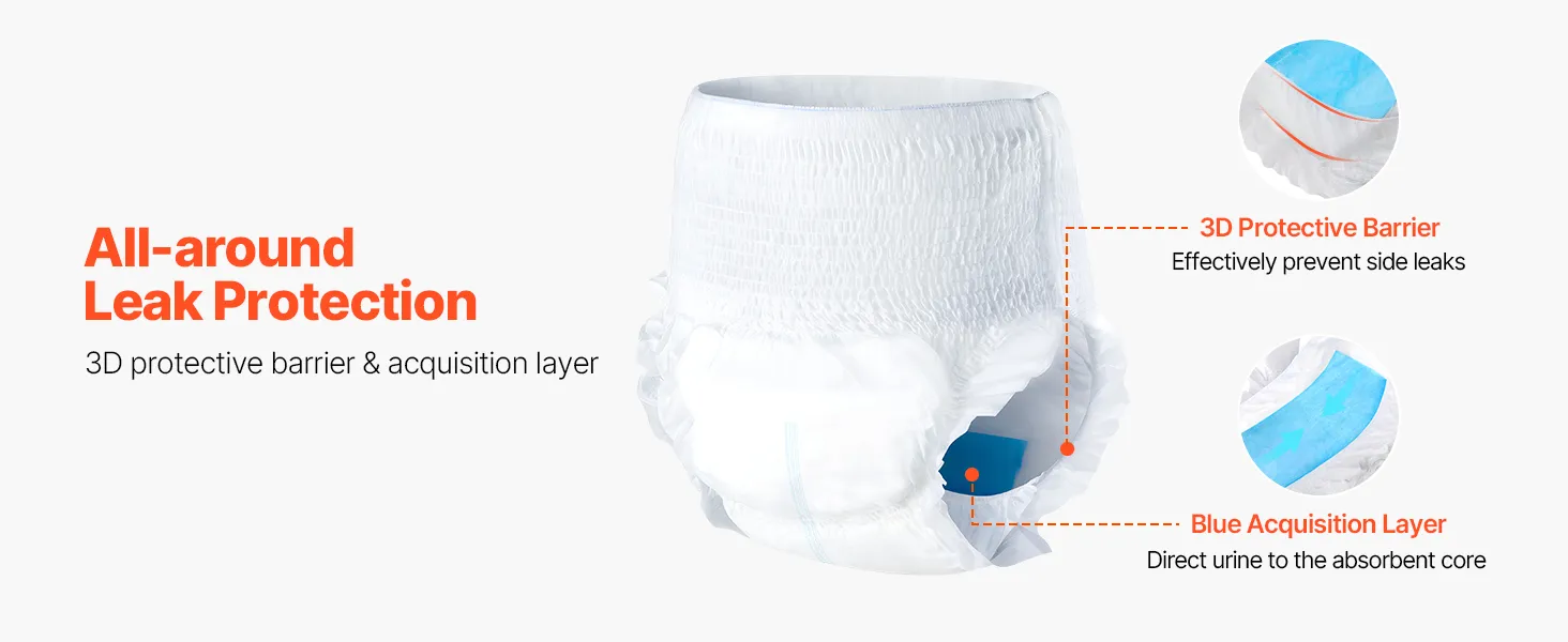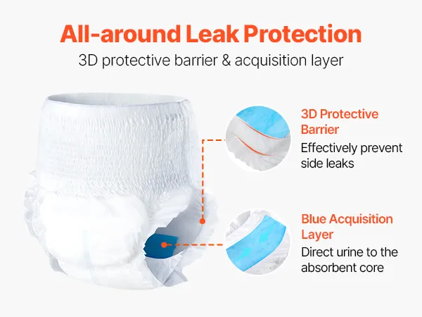 Te pieluchy dla dorosłych są wykonane z miękkiego, oddychającego materiału i mają szybko odprowadzającą wilgoć warstwę wierzchnią z włókniny oraz wysoce chłonny rdzeń dla zapewnienia najwyższego komfortu i niezawodnej ochrony. Są wygodne w noszeniu, tak jak zwykła bielizna, zapewniając bezwysiłkowe i wygodne noszenie.