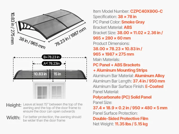 Daszek na drzwi wejściowe VEVOR, 965 x 1987 mm, daszek łukowy, dach z odwodnieniem i uchwytem ABS, ochrona przed deszczem, śniegiem i słońcem, daszek z poliwęglanu na werandę i taras, kolor dymny szary Daszek na drzwi wejściowe VEVOR, 965 x 1987 mm, daszek łukowy, dach z odwodnieniem i uchwytem ABS, ochrona przed deszczem, śniegiem i słońcem, daszek z poliwęglanu na werandę i taras, kolor dymny szary