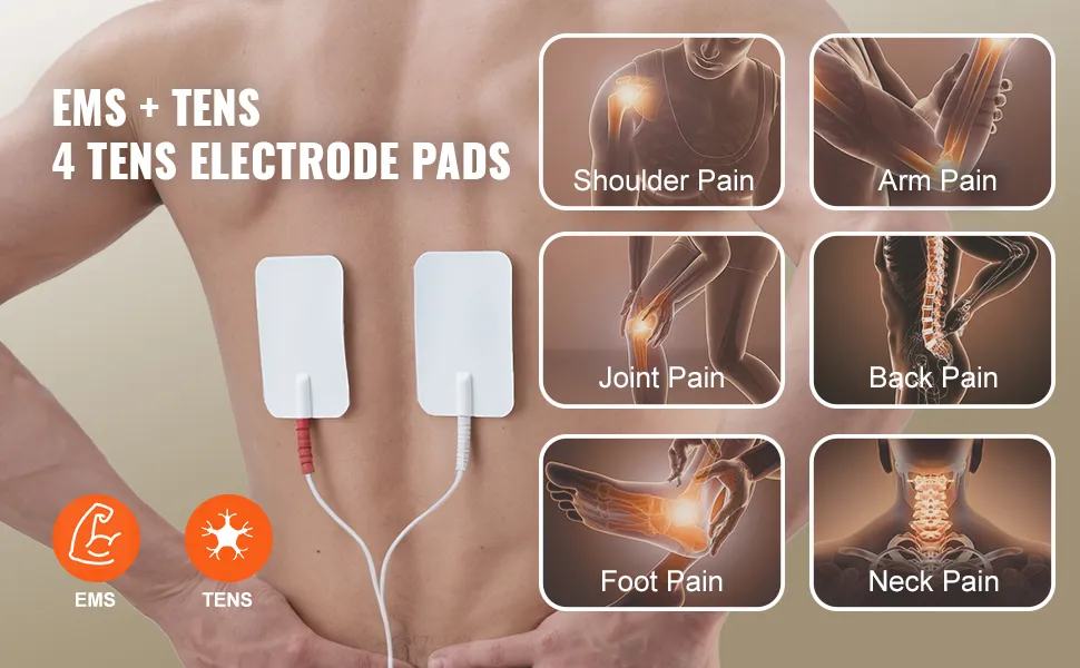 Ulga dla całego ciała: Niezależnie od tego, czy cierpisz na ból barku, ramienia, stawów, dolnej części pleców, stóp czy szyi, ten elektryczny stymulator stóp zapewnia kompleksową ulgę. Dołączone elektrody TENS 4 + 4 można stosować na różnych częściach ciała. (Uwaga: 4 elektrody można stosować jednocześnie; 4 dodatkowe elektrody są dostarczane jako zapasowe).