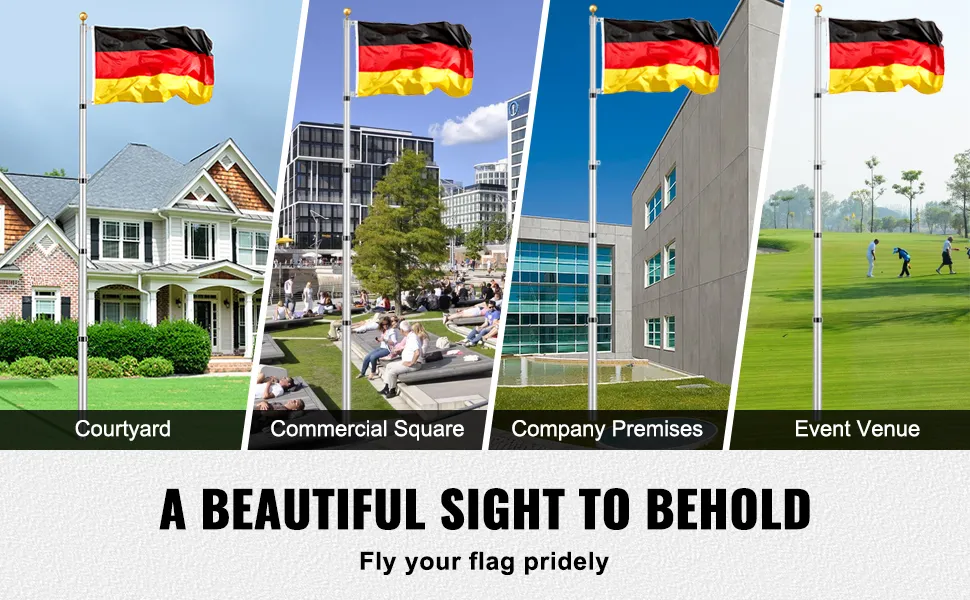Zestaw teleskopowych masztów flagowych VEVOR o długości 20 stóp, wytrzymały zestaw masztów flagowych ze stopu aluminium do wkopania w ziemię, do stosowania na zewnątrz, 3 tryby ekspozycji, maszt flagowy z profesjonalnymi akcesoriami, flaga niemiecka, srebrny