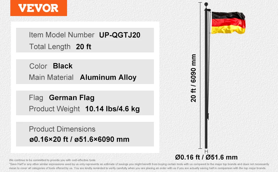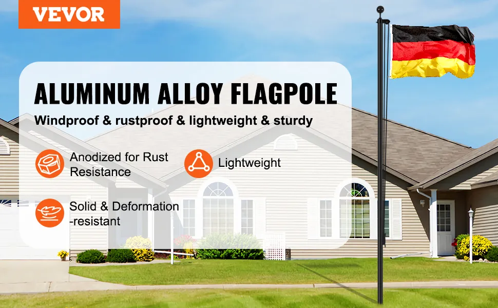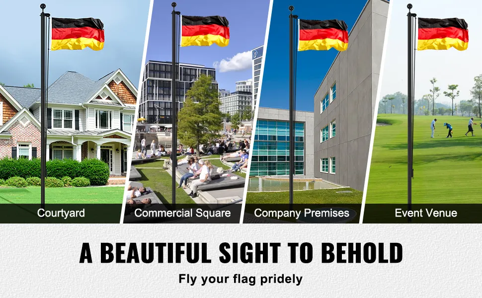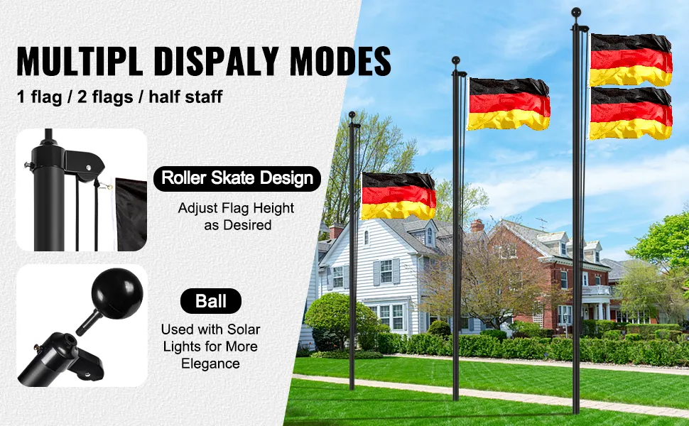 Zestaw masztów flagowych VEVOR o długości 20 stóp, solidny zestaw masztów flagowych ze stopu aluminium do wkopania w ziemię do użytku na zewnątrz, maszt z 3 trybami wyświetlania i profesjonalnymi akcesoriami, flaga niemiecka, kolor czarny