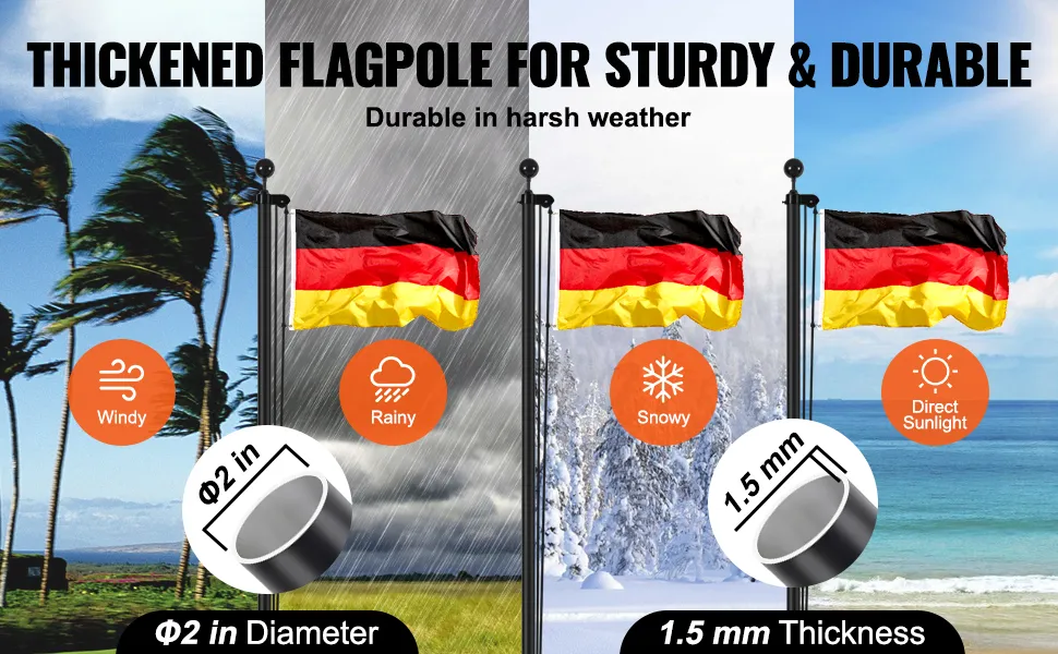 Dzięki grubościennej konstrukcji o średnicy 5,08 cm (2 cale) nasz maszt flagowy zapewnia solidną nośność. Jest odporny na niekorzystne warunki atmosferyczne, takie jak burze, trudne warunki atmosferyczne i światło słoneczne.