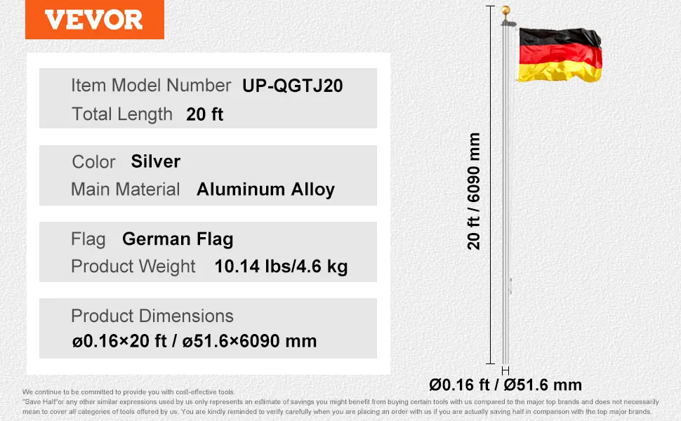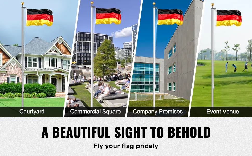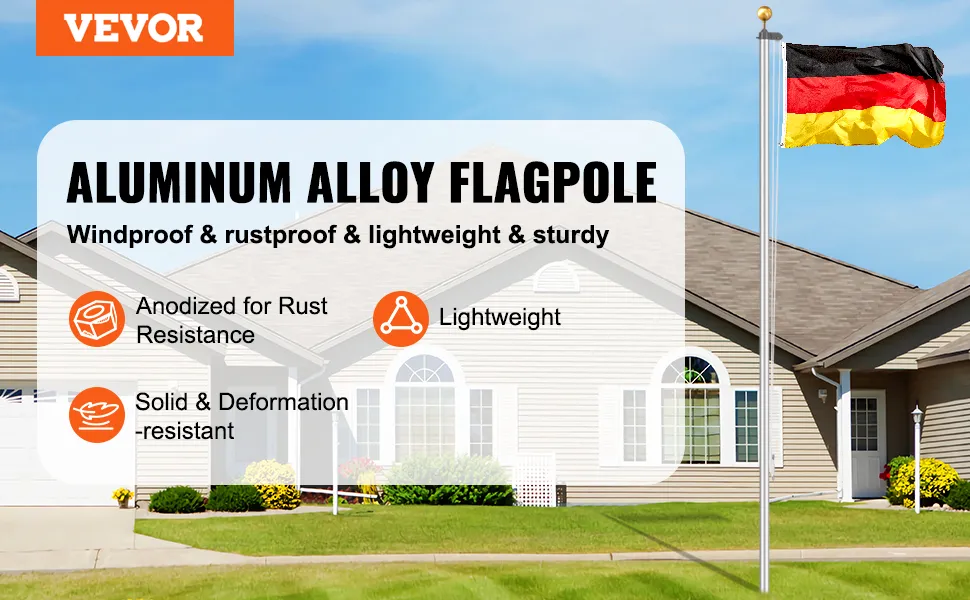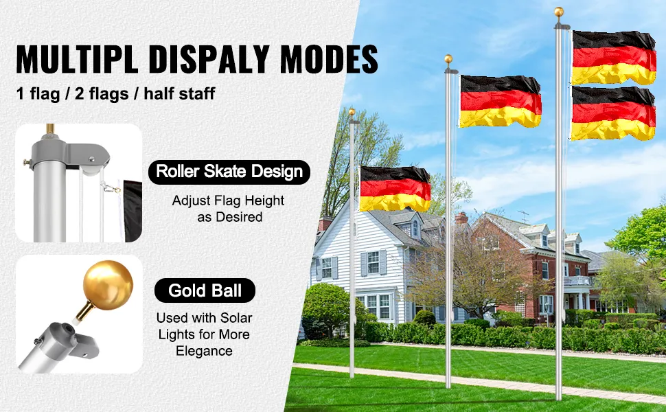 Zestaw masztów flagowych VEVOR o długości 20 stóp, solidny zestaw masztów flagowych ze stopu aluminium do wkopania w ziemię do użytku na zewnątrz, maszt z 3 trybami wyświetlania i profesjonalnymi akcesoriami, flaga niemiecka, srebrny