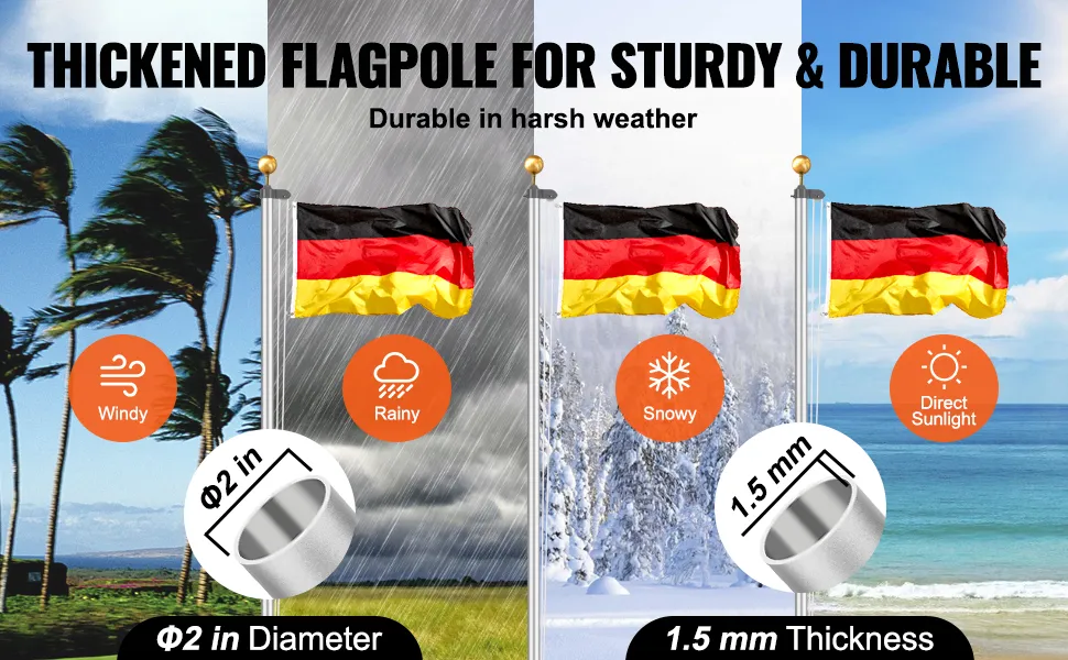 Dzięki grubościennej konstrukcji o średnicy 2 cali (5,08 cm) nasz maszt flagowy zapewnia solidną nośność. Jest odporny na niekorzystne warunki atmosferyczne, takie jak burze, trudne warunki pogodowe i światło słoneczne.