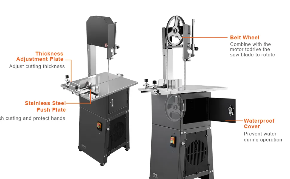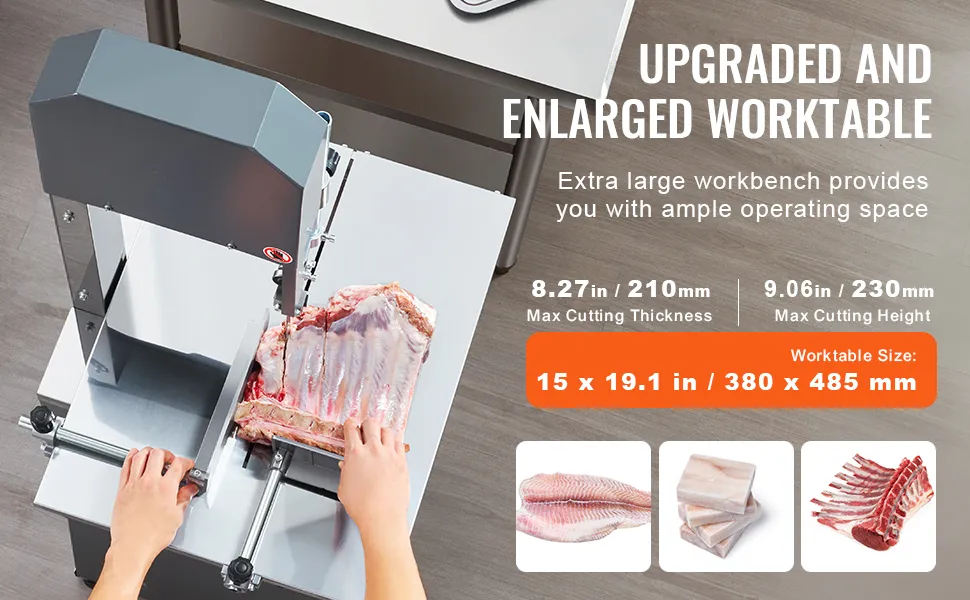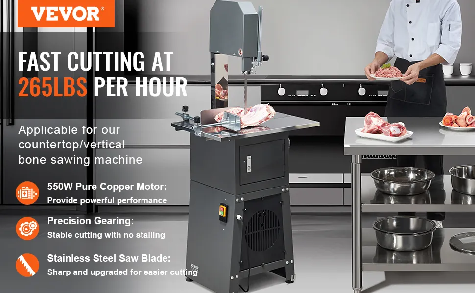 VEVOR Komercyjna elektryczna piła taśmowa do mięsa, pionowa piła do kości o mocy 550 W, stół warsztatowy 380 x 485 mm, maszyna do cięcia kości, krajalnica do mrożonego mięsa z ostrzem do żeberek i wieprzowiny