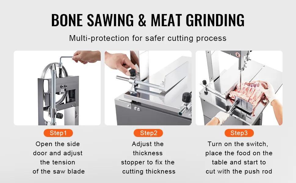 Piły do kości i maszynki do mielenia mięsa ułatwiają mielenie mięsa bezpośrednio po pokrojeniu. Idealnie nadają się do krojenia żeberek wieprzowych, mrożonek i innych mięs. Są szeroko stosowane w hotelach, kuchniach domowych i innych miejscach.