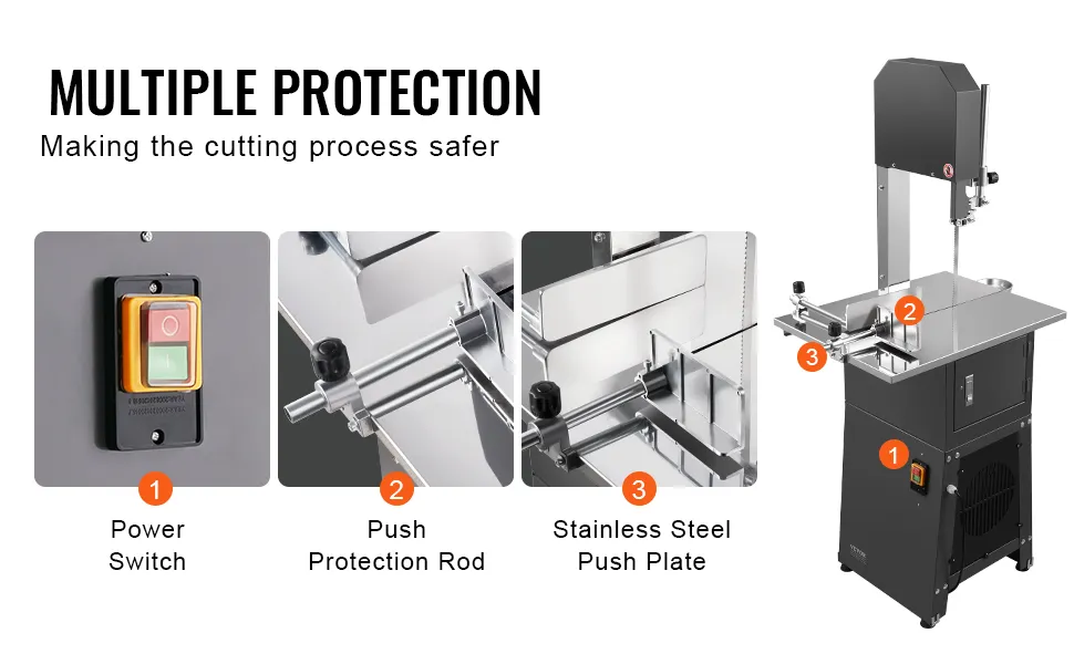 Nasza piła do mięsa jest wyposażona w płytę dociskową i listwę dociskową ze stali nierdzewnej, dzięki czemu Twoje dłonie pozostają z dala od ostrego ostrza piły podczas pracy. Dzięki temu czujesz się bezpiecznie przez cały proces cięcia.