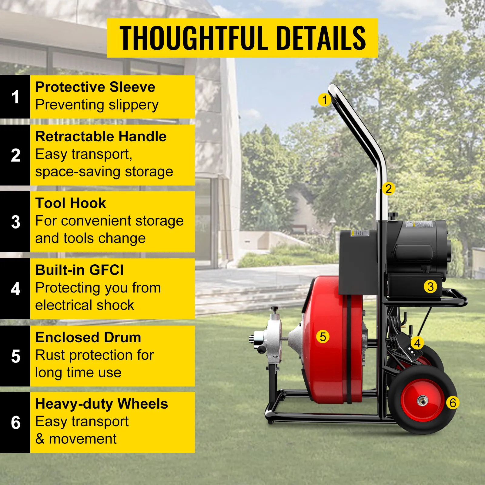Nasz wąż kanalizacyjny został zaprojektowany z myślą o każdym szczególe, aby zapewnić Ci bezpieczeństwo i wydłużyć jego żywotność. Wbudowany GFCI zapobiega porażeniu prądem. Wysuwany uchwyt z osłoną ochronną i wytrzymałe koła umożliwiają wygodne przemieszczanie się po miejscu pracy.