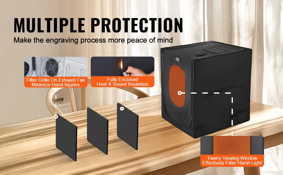 Całkowicie zamknięta obudowa grawera laserowego skutecznie izoluje ciepło, dźwięk i zapach. Wyposażony w wentylator wyciągowy z kratką filtra, aby zminimalizować obrażenia dłoni. Żółto-brązowa konstrukcja okna PCV skutecznie filtruje światło niebieskie, zwiększając komfort pracy.
