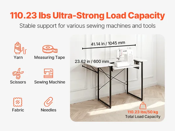Ten stół do maszyny do szycia charakteryzuje się udźwigiem 50 kg i zapewnia stabilne podparcie dla dużych maszyn do szycia i różnych narzędzi. Przestronna powierzchnia robocza oferuje dużo miejsca na nici, tkaniny, nożyczki, maszyny do szycia i szpilki.