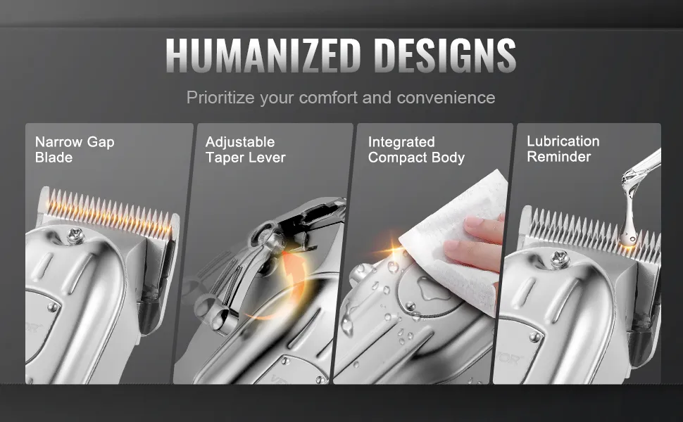 Wąskie ostrze, ergonomiczny uchwyt, regulowana dźwignia stożkowa i pomocny wskaźnik konieczności smarowania zostały starannie zaprojektowane, aby zapewnić łatwą i wygodną pielęgnację oraz sprawić, że strzyżenie włosów będzie o wiele łatwiejsze.