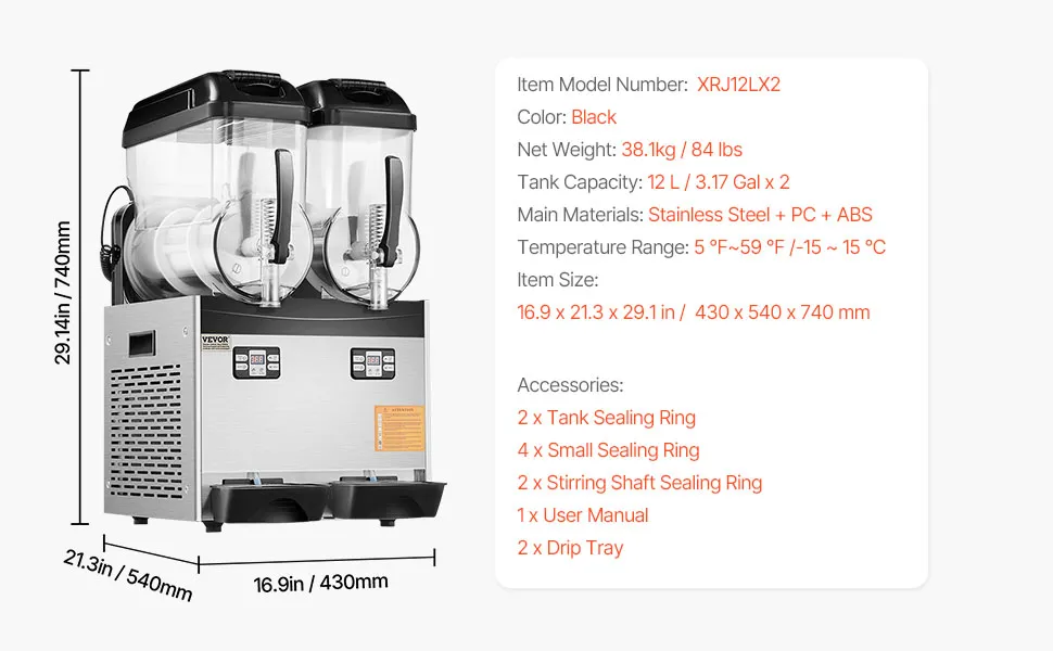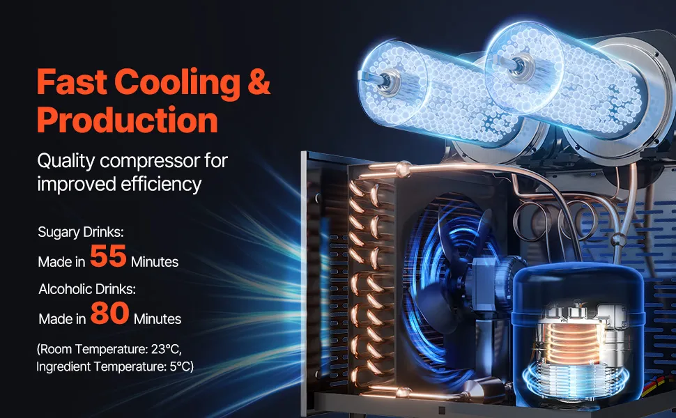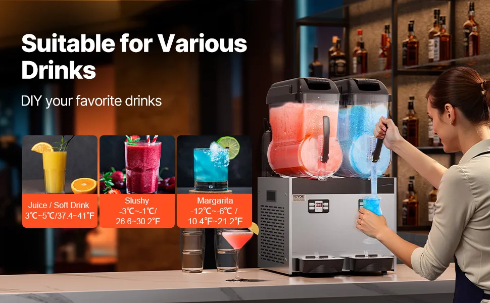 Do różnych napojów: Ta ulepszona, komercyjna maszyna do produkcji mrożonego lodu oferuje regulowany zakres temperatury od -15 do 15°C (od 5 do 59°F), co pozwala kontrolować miękkość lub twardość napojów. Dla napojów zimnych: od 3 do 5°C (od 37,4 do 41°F); dla mrożonych napojów bezalkoholowych: od -3 do -1°C (od 26,6 do 30,2°F); dla napojów alkoholowych: od -12 do -6°C (od 10,4 do 21,2°F). (Zalecana zawartość cukru: około 13%, zawartość alkoholu: poniżej 13%).
