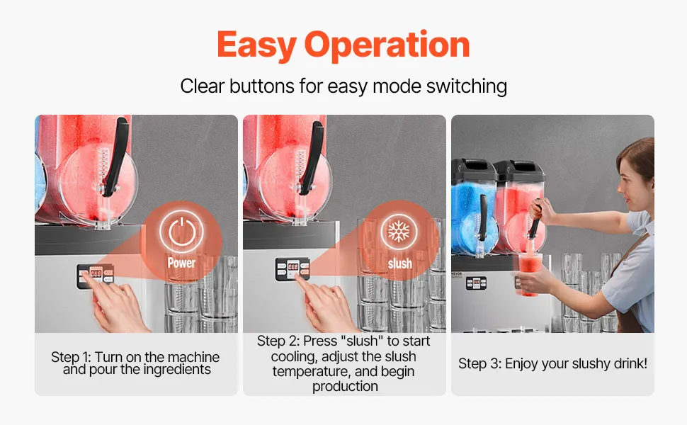 Łatwa obsługa: Przyjazny dla użytkownika panel sterowania umożliwia łatwą obsługę, w tym dwa tryby pracy (lody kruszone i zimne napoje), automatyczne czyszczenie, kontrolę temperatury i ustawienia czasu. Temperatura jest wyraźnie wyświetlana na ekranie cyfrowym, co ułatwia jej monitorowanie w dowolnym momencie.