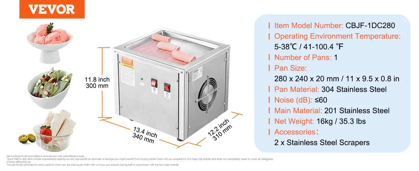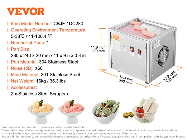 Maszyna do smażonych lodów w rolkach VEVOR, patelnia 28 x 24 x 2 cm do smażenia lodów, maszyna do lodów z kompresorem i 2 skrobakami, do produkcji lodów, mrożonego jogurtu i lodów w rolkach