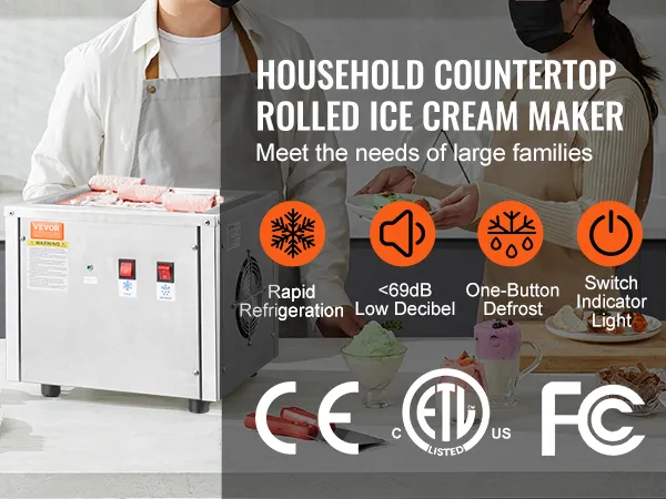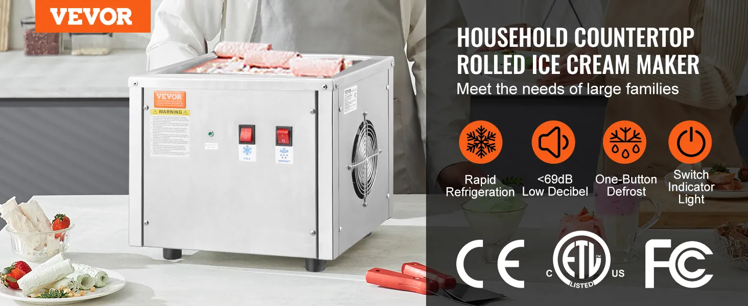 Szybkie chłodzenie: Frytkownica do lodów w rolkach wyposażona jest w sprężarkowy układ chłodzenia z bezszwowymi rurami miedzianymi w kształcie litery U, który osiąga wymaganą temperaturę produkcyjną po ośmiu minutach przestoju