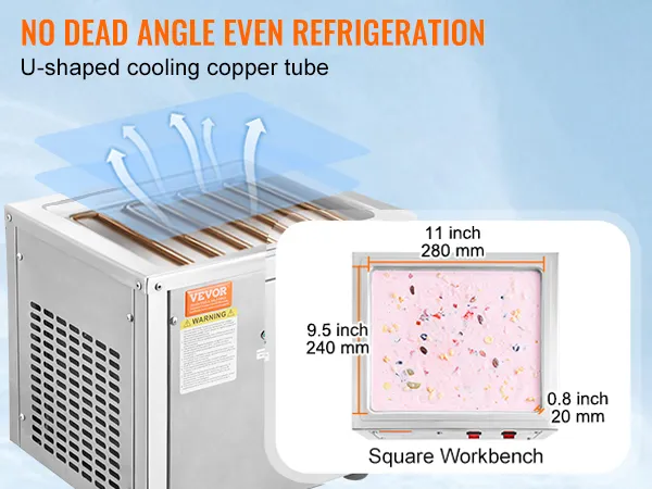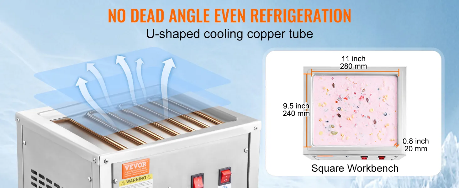 Nasza maszyna do lodów rolowanych wyposażona jest w zintegrowany układ chłodzenia w kształcie litery U, wykonany z rur miedzianych, co eliminuje martwą przestrzeń i znacznie poprawia wydajność chłodzenia. Duża powierzchnia robocza zapewnia dużo miejsca i zapobiega rozlewaniu się produktu.