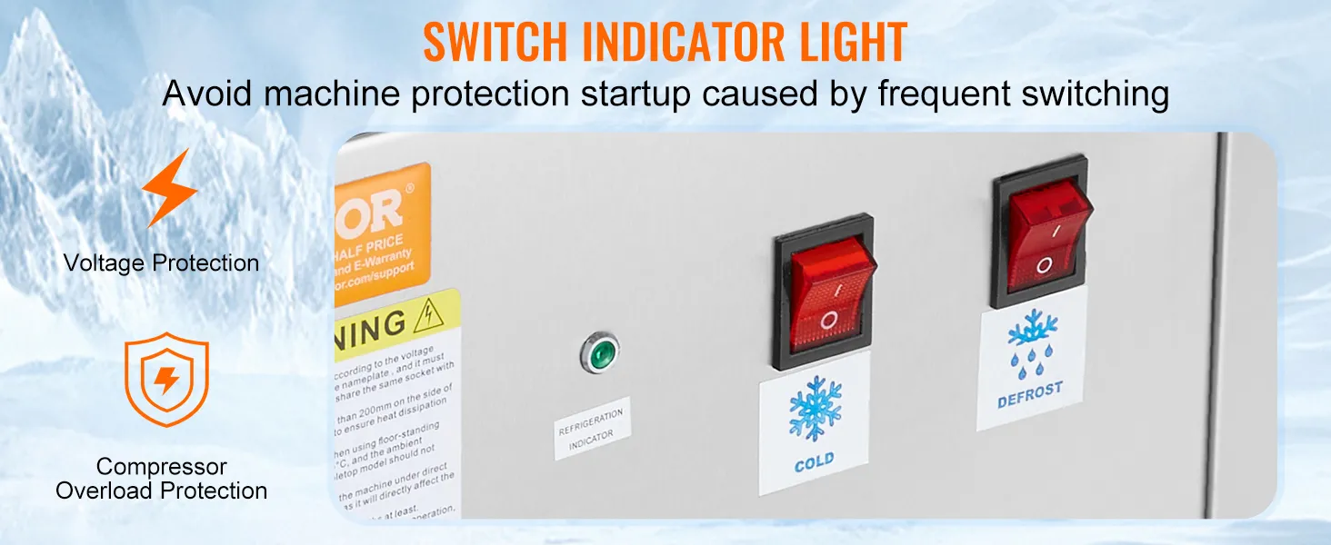 Konstrukcja ze stali nierdzewnej: stal nierdzewna SUS304 dopuszczona do kontaktu z żywnością w przypadku pojemnika na lody oraz stal nierdzewna SUS201 w przypadku obudowy zewnętrznej zapewniają odporność na rdzę i ochronę przed korozją, umożliwiając łatwe czyszczenie.