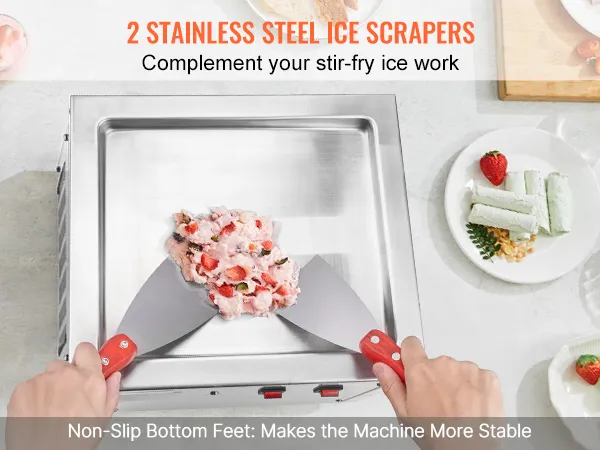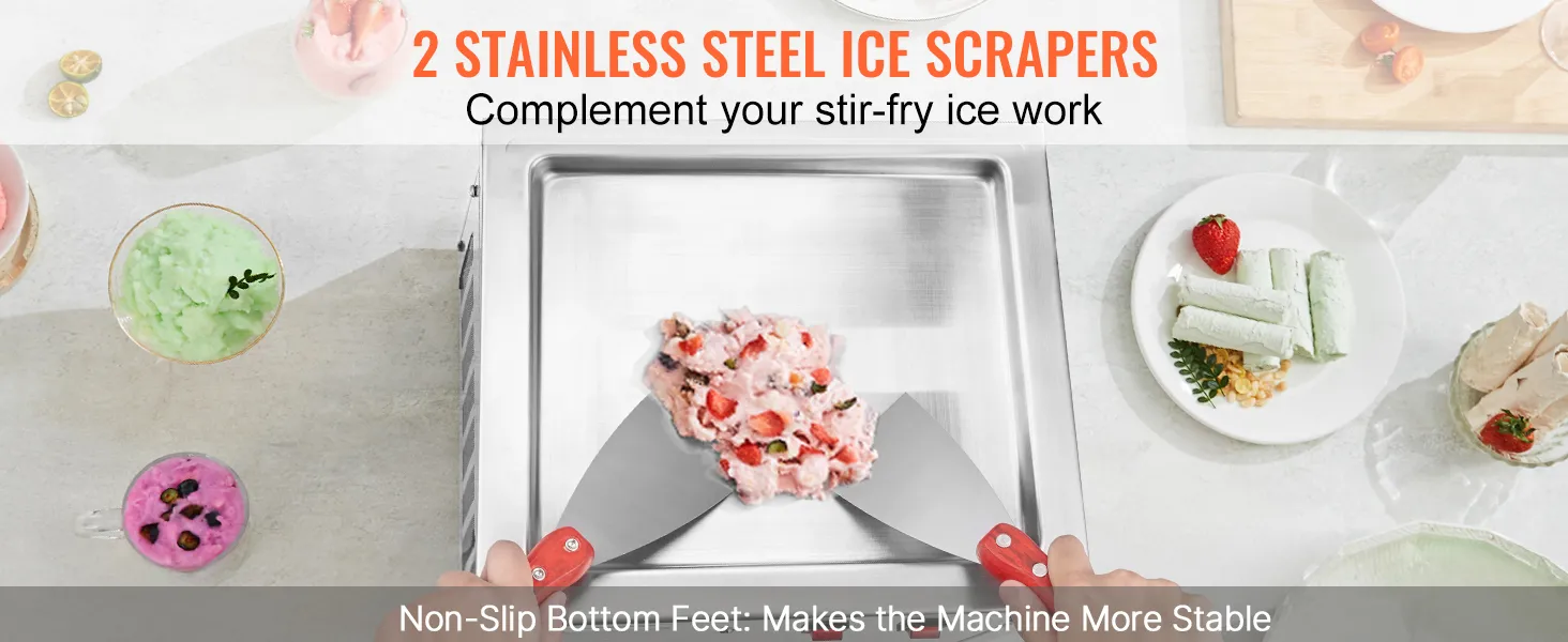 Maszyna do robienia lodów w rolkach jest wyposażona w dwie stalowe skrobaczki do lodów z drewnianymi uchwytami i ostrzami ze stali nierdzewnej. Wysyp składniki na blat roboczy i użyj skrobaczek, aby wymieszać, rozdrobnić lub zwinąć lody w rolkę.