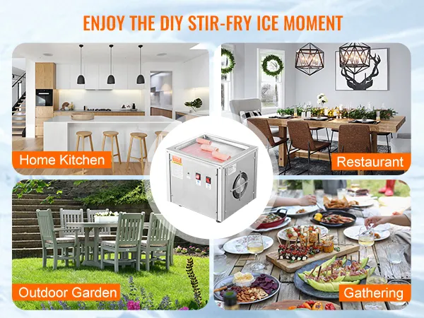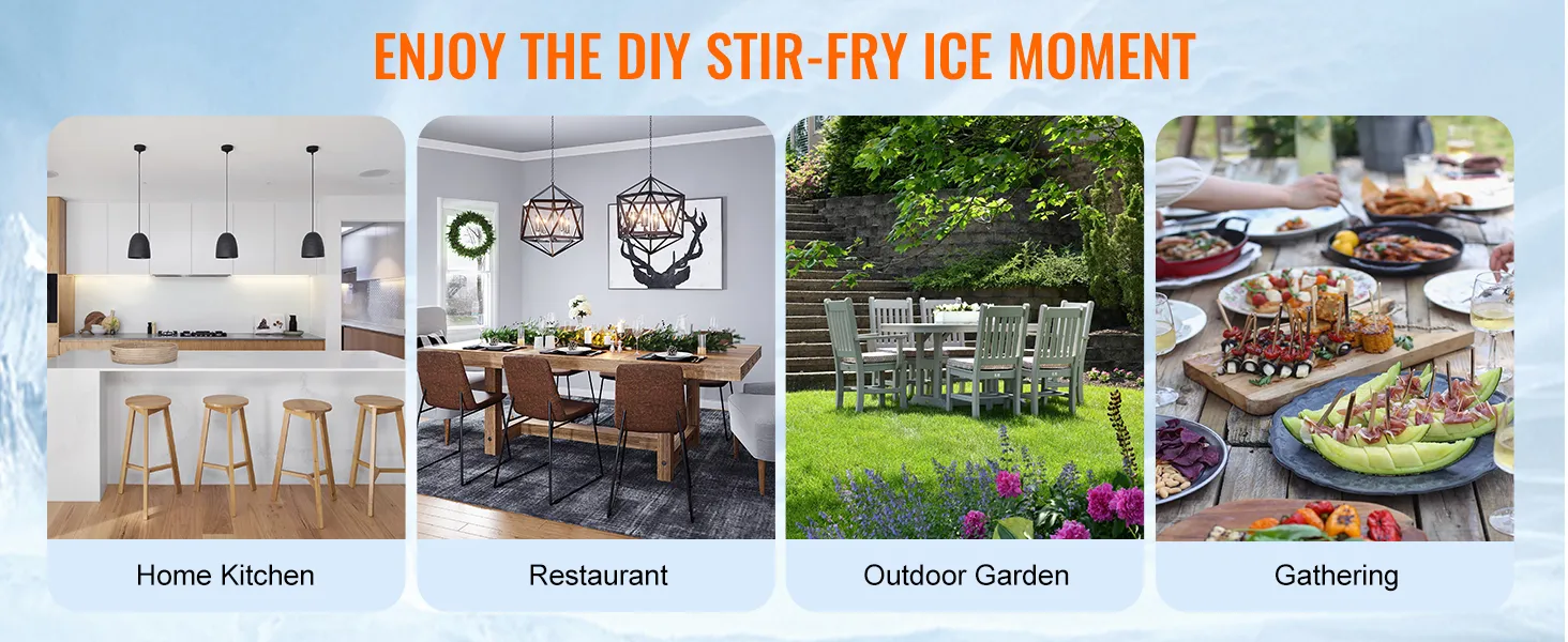 Duża powierzchnia robocza: wykonana z nierdzewnej stali SUS304 przeznaczonej do kontaktu z żywnością, z której wykonano pojemnik na lód, oraz ze stali nierdzewnej SUS201, z której wykonano część zewnętrzną, co zapewnia odporność na rdzę i ochronę przed korozją, a także łatwość czyszczenia.