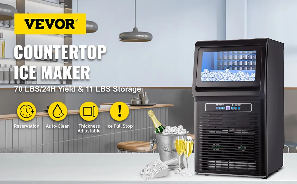 • 【Wydajne wytwarzanie lodu】 - Nablatowa kostkarka do lodu VEVOR jest zasilana przez sprężarkę o mocy 350 W i zapewnia wydajne wytwarzanie lodu, wytwarzając około 70 funtów (31,75 kg) co 24 godziny dzięki wbudowanym 36 sztuk (4 x 9) kostek lodu. Każdy cykl wytwarzania lodu trwa 8-15 minut i określa, czy kostki lodu są grubsze, czy cieńsze. Różne grubości służą różnym celom. Poza tym ta kompaktowa kostkarka do lodu może pomieścić około 5 kg kostek lodu i jest odpowiednia dla gospodarstw domowych, barów, sklepów spożywczych itp.