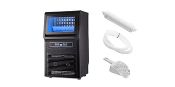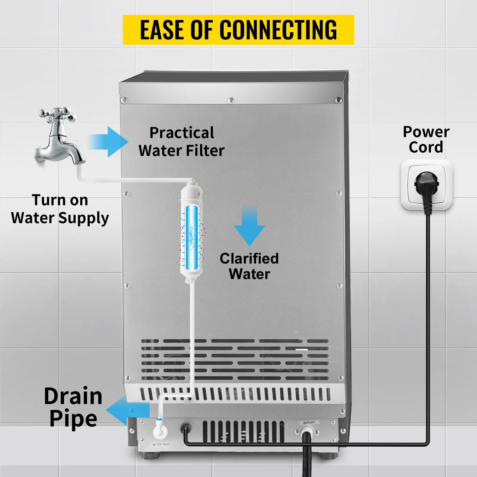Dzięki dołączonemu filtrowi wody naszą nablatową kostkarkę do lodu można podłączyć bezpośrednio do kranu, aby przekształcić wodę z kranu w czystą wodę zdatną do picia i wyprodukować czyste, higieniczne i krystalicznie czyste kostki lodu. Rura spustowa służy również do odprowadzania stopionego lodu.