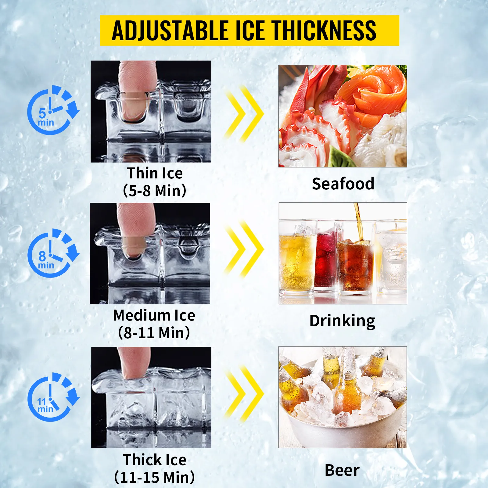 Ta automatyczna kostkarka do lodu może wytwarzać krystalicznie czyste kostki lodu o wymiarach 22 x 22 x 22 mm (0,9 x 0,9 x 0,9 cala). Grubość lodu zależy od różnych czasów wytwarzania lodu. Cienkie kostki lodu (5-8 min) nadają się do dekoracji i zamrażania owoców morza, średnie (8-11 min) do koktajli, a grube (11-15 min) do schładzania piwa.