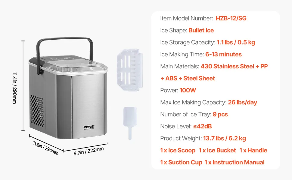 Cicha i przenośna: kostkarka do lodu pracuje z poziomem hałasu poniżej 42 dB, porównywalnym z hałasem działającej lodówki. Kompaktowa konstrukcja z uchwytem i wymiary 8,7 x 11,6 x 11,4 cala (222 x 294 x 290 mm) sprawiają, że nadaje się do użytku w pokojach, biurach, restauracjach i innych miejscach.