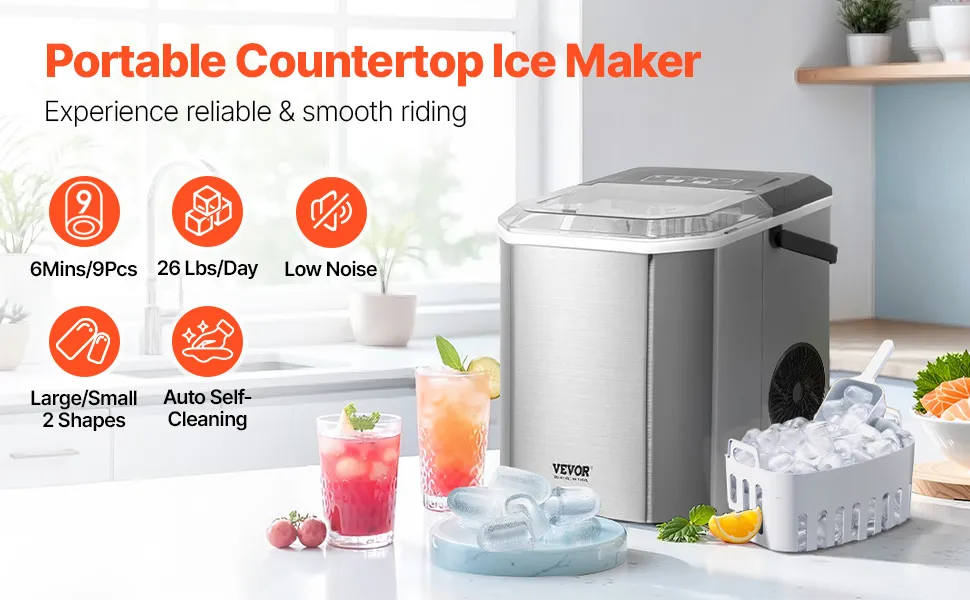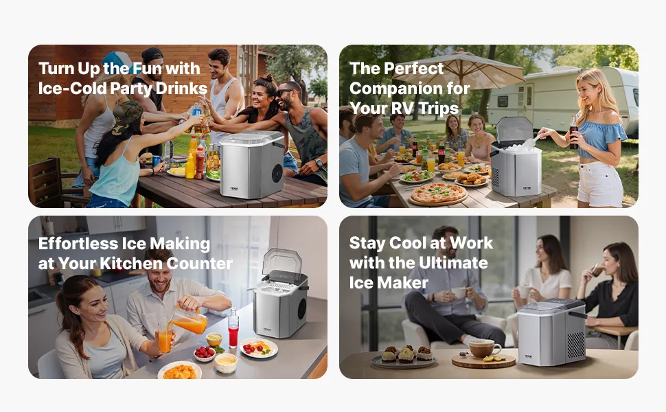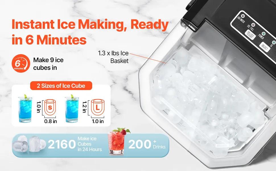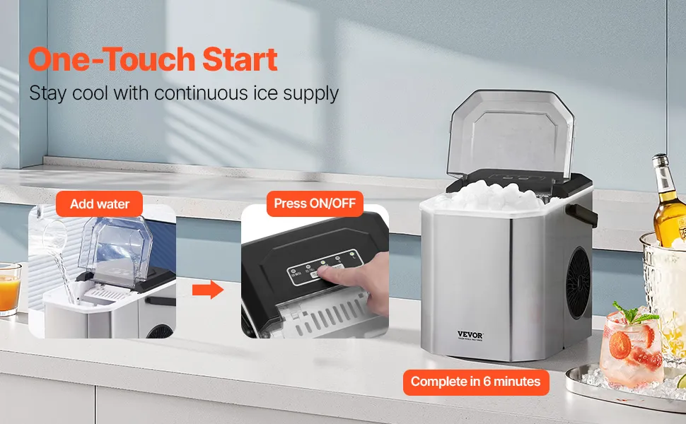 Produkuje 11,8 kg lodu dziennie i 9 kostek lodu w zaledwie 6 minut. Dzięki pojemności 0,5 kg i trwałej izolacji idealnie nadaje się na imprezy i pikniki. Dostarcza czysty lód zawsze, gdy go potrzebujesz, dzięki czemu możesz cieszyć się chłodnymi napojami o każdej porze.
